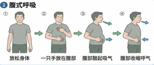 腹式呼吸:手放腹部,吸气时鼓起,呼气时收缩;循序渐进地进行步行、太极拳等锻炼。