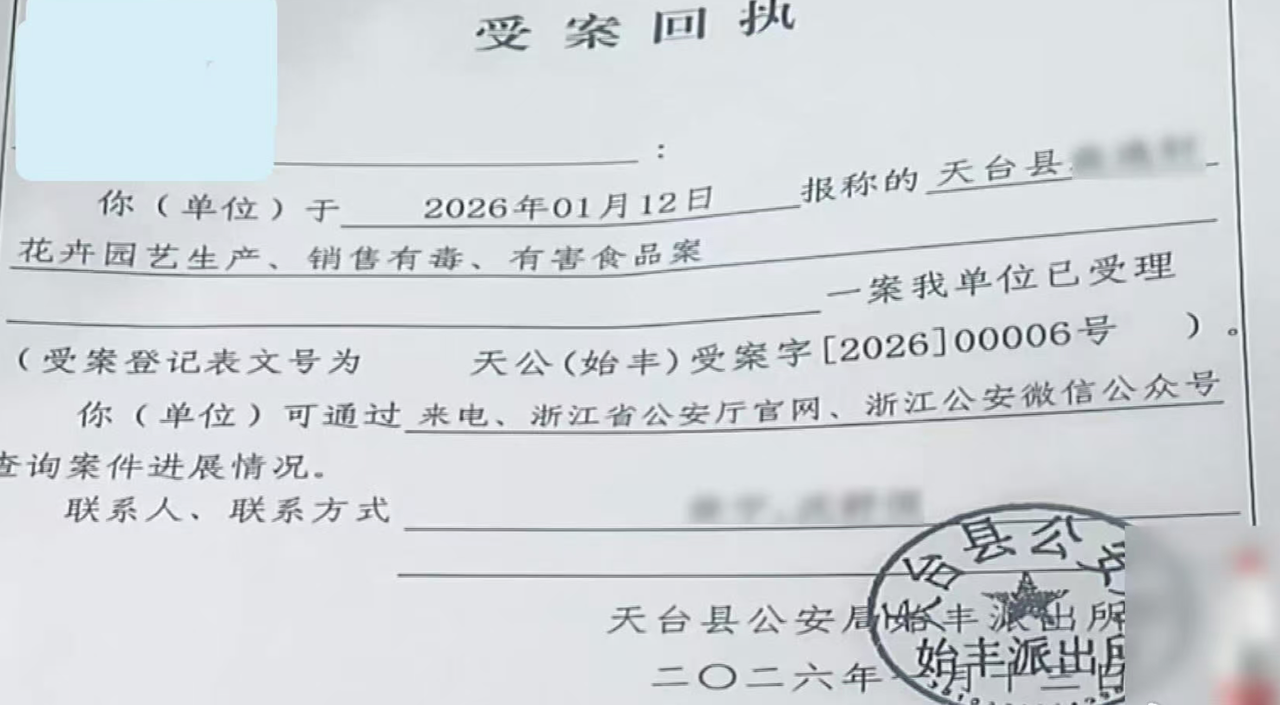 事发后,杨女士在1月12日向天台县警方报案,并于1月13日拿到“森逸轩花卉园艺生产、销售有毒、有害食品案”的受案回执。