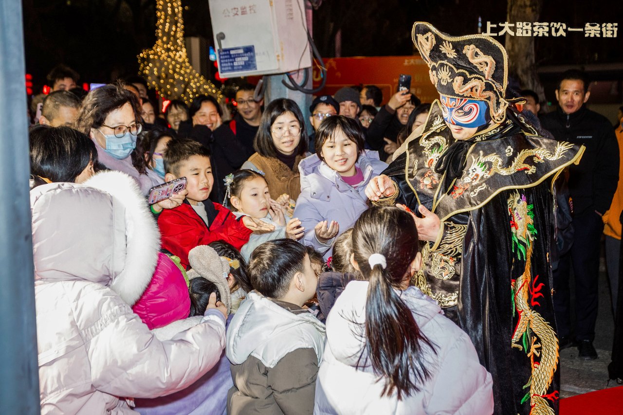 假期内,上大路全线客流持续攀升,街区消费热度显著上涨。“见与不见”“绍兴”主题打卡点前排起长队,小罐茶馆、niduu咖啡馆等茶饮门店保持满员状态,小堂沿、绍荟宴等特色餐饮持续翻台至下午2时。夜幕降临,“古街贺春·喜乐巡游”准时上演,金龙、祥狮、鱼灯组成巡游队伍,搭配魔术杂技、宋韵国乐、国风舞蹈、潮流乐队等展演节目,实现古风韵味与现代潮流的有机融合,成为夜间文旅一大亮点。