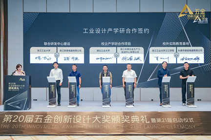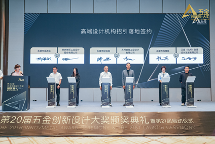 颁奖现场,永康市多个政府部门分别与杭州博乐工业设计股份有限公司、苏州睿梵工业设计有限公司、汉度(杭州)创意设计发展有限公司三家市外高端设计机构签署合作协议。同时,浙江工业大学与安德电器、湖北工业大学与浙江永康五金生产力促进中心、浙江工业大学之江学院与德诺电器分别建立产学研合作机制,将围绕人机工程、智能制造、低碳工艺等方向展开联合攻关。