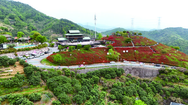 4月,曹宅镇鹤岩山村横腊自然村春意正浓,漫山遍野的杜鹃花怒放。在山腰观景平台上,从杭州自驾过来的陈女士举着手机记录花海中翩然起舞的女儿,笑得眉眼弯弯。