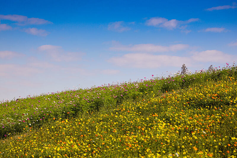 站在山坡下抬头望去,大片的绿草地与彩色的花海交相辉映,蓝天白云的映衬下,整个场景如诗如画,令人心旷神怡。游客们纷纷赞叹不已,纷纷表示不虚此行。