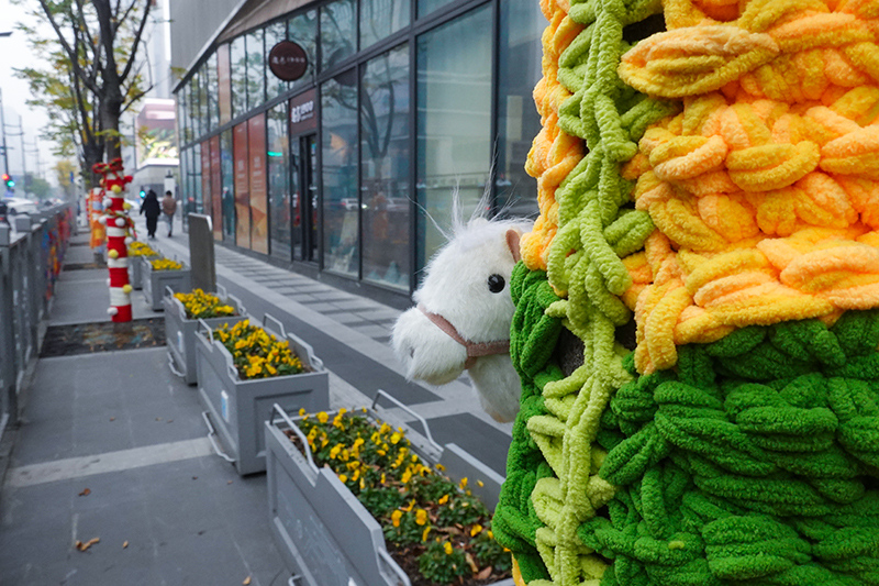 近期,杭州湖滨解百周边的街头成了新晋网红打卡地,30余个石墩子与近20个雪糕筒集体换上手工编织的“多巴胺色毛衣”,用绚烂色彩与柔软质感点亮冬日街头,市民游客纷纷驻足拍照,更收获了外国友人的青睐。