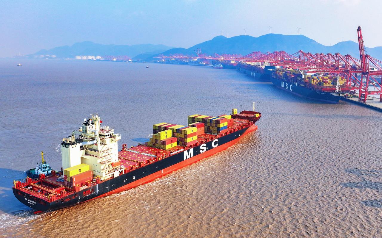 1月8日下午,随着澳洲航线首航货船“地中海杰西尼亚”轮缓缓靠泊宁波舟山港穿山港区,宁波舟山港迎来2026年首条新航线。