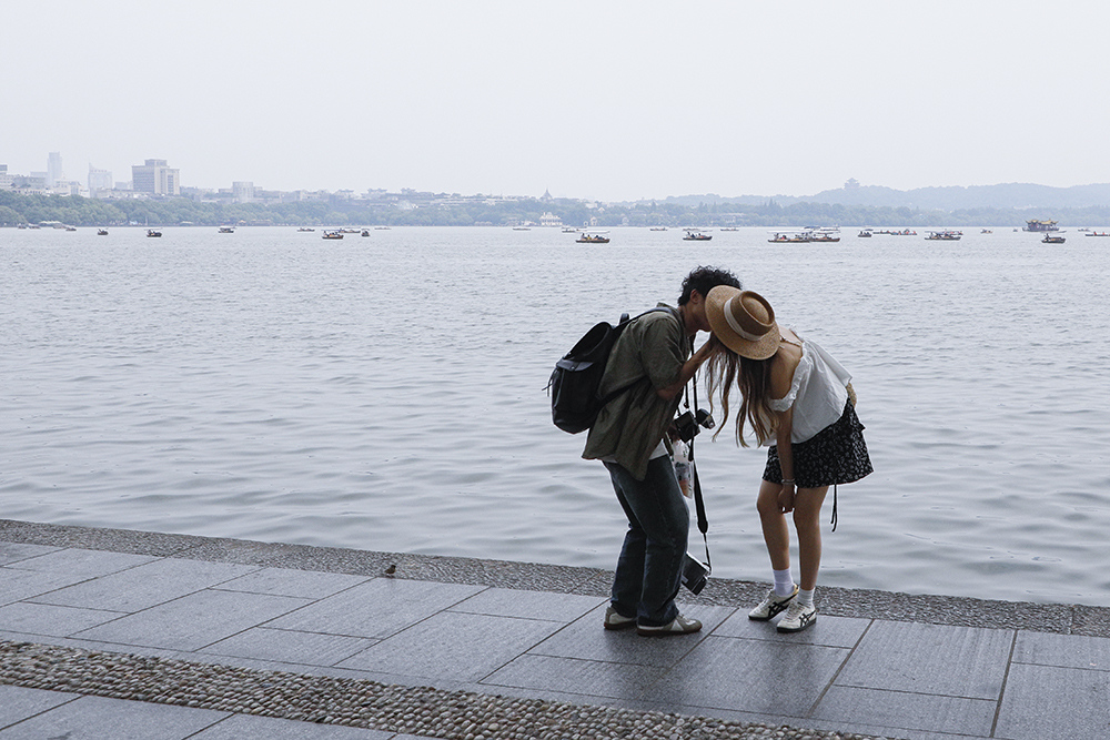 一对情侣在西湖边接吻