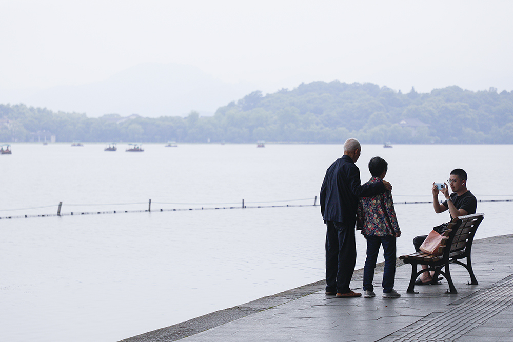 一对老夫妻在西湖边请路人帮忙合影