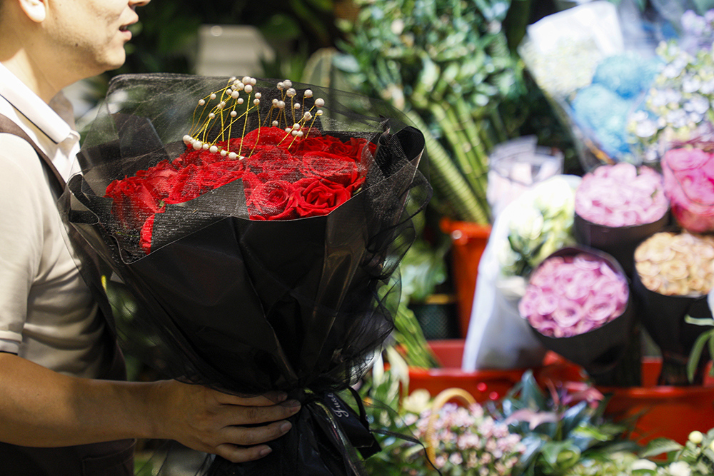 老板为了晚上的活动正在包扎单枝玫瑰