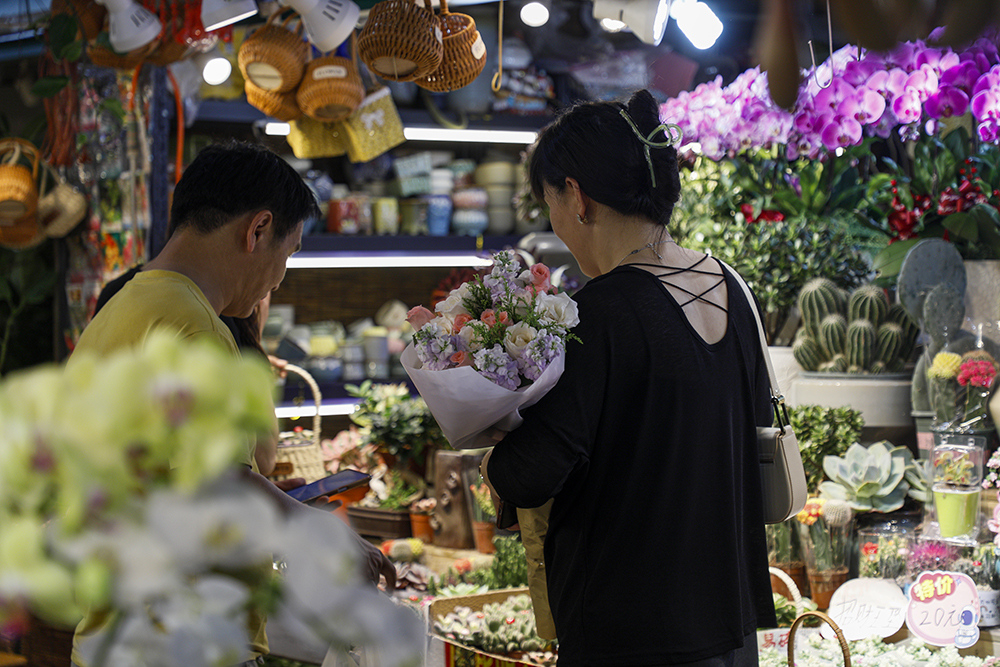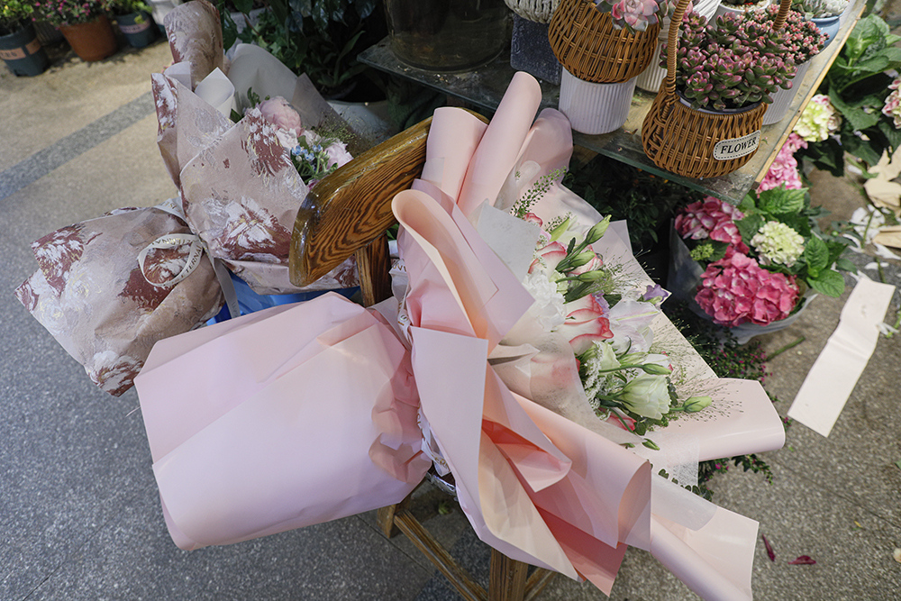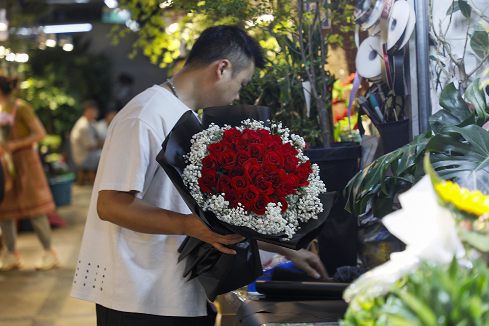 走进吴山花鸟城,就看到各家花店里老板们忙碌的身影。花店老板告诉记者,现在很多客人都是在各大平台下单,线下来购买的人相对少了。一个闪送的小哥告诉记者,仅一个上午,他就已经送了40个鲜花的单子了。