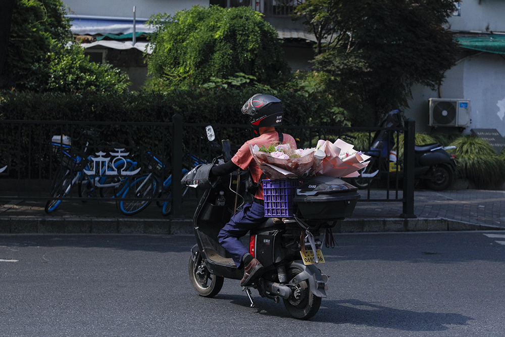 路上送花的闪送小哥