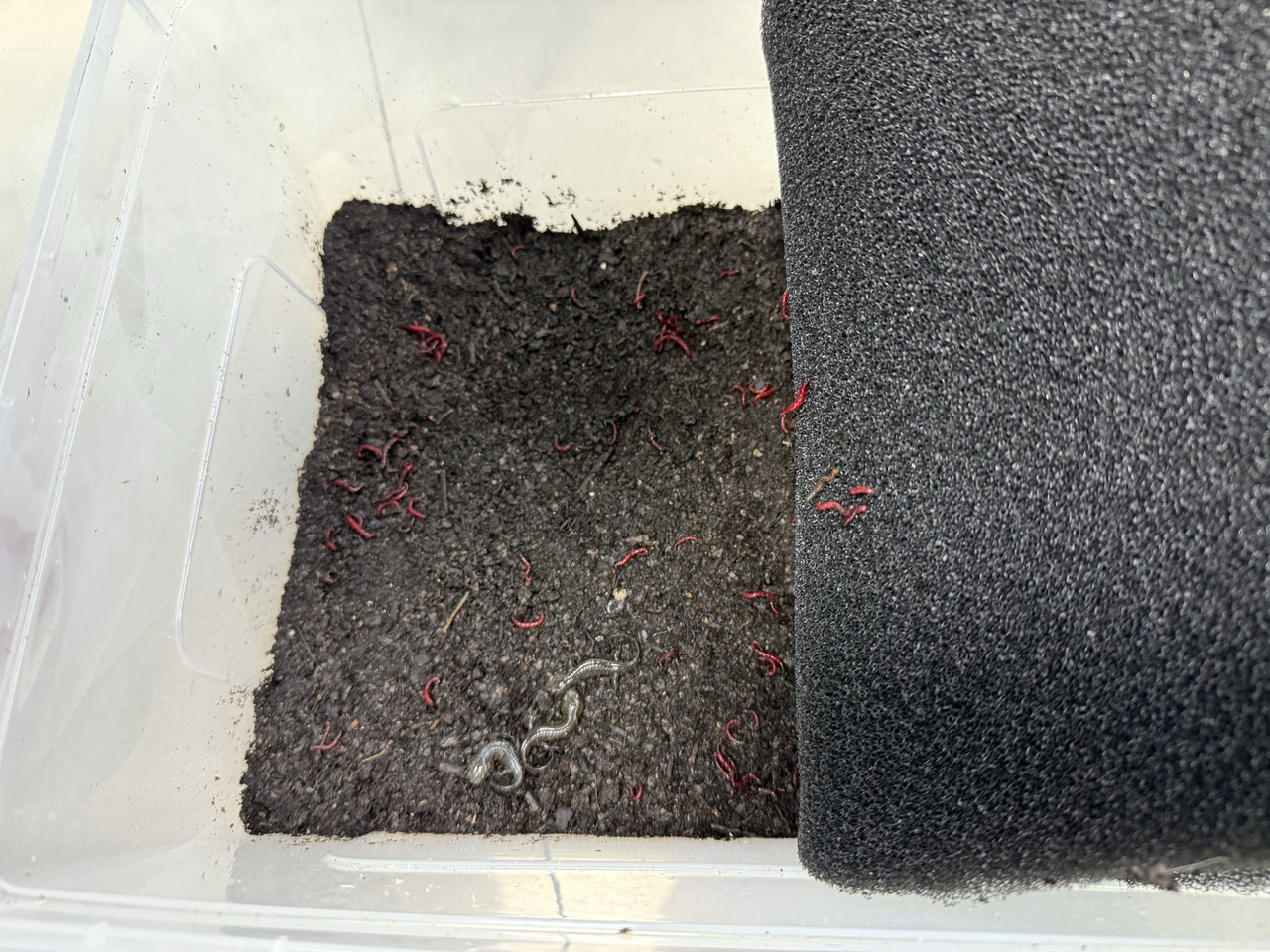 度过危机四伏的“童年”后,这些安吉小鲵也将从“游泳池”搬家到“陆地”上。在保护站一楼内,汪贤挺将记者带到一个个透明的长方形盒子前。掀开盒内的黑色泡沫材料,指甲盖大小的安吉小鲵幼体趴在黑色土壤上,几乎与其融为一体。“这些是退了腮的小鲵,黑色泡沫模拟了泥炭藓里的环境,别看它们懒洋洋的,捕食时却很凶猛。”汪贤挺指着周边的扭动红虫介绍,这便是安吉小鲵的食物。