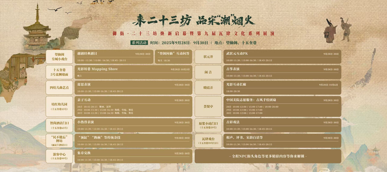 据悉,“来二十三坊 品宋‘潮’烟火——御街·二十三坊焕新启幕暨第九届瓦肆文化系列展演”将于9月28日在望仙阁拉开序幕,为期三天,整个二十三坊街区将成为没有围墙的“移动小剧场”。市民游客可在荟贤亭体验活字印刷、在状元井饮一杯“状元茶”与“武状元”比试射箭、与“巡街武卒”合影留念解锁打卡隐藏项目。街巷不再是通道,而是可停留、可体验、可叙事的文化场景。