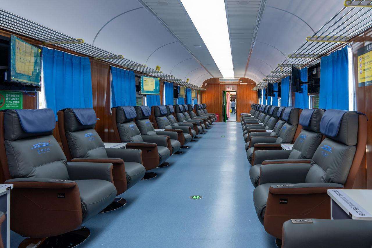进门后,乘客需要登记自己的车次信息和身份信息,工作人员会发放一张写有座位号的卡片,乘客即可对号入座。车厢内,别有一番天地:空调、座椅、开水供应等服务全部免费开放,每节车厢都设有1个育婴处。126组多功能一体化电动沙发具备多角度调节功能,乘客仅需按下座位扶手上的按钮,即可实现110度半卧。