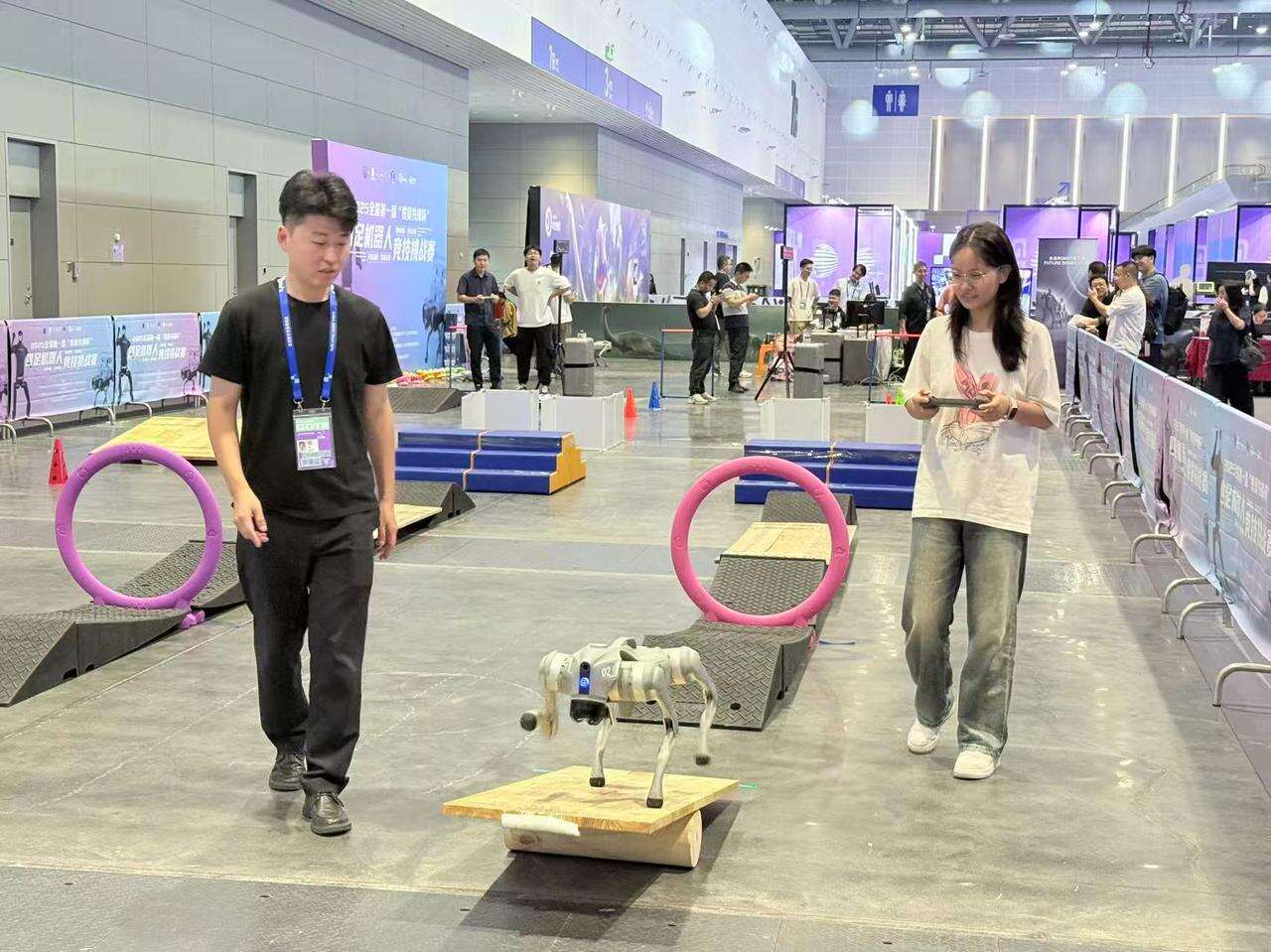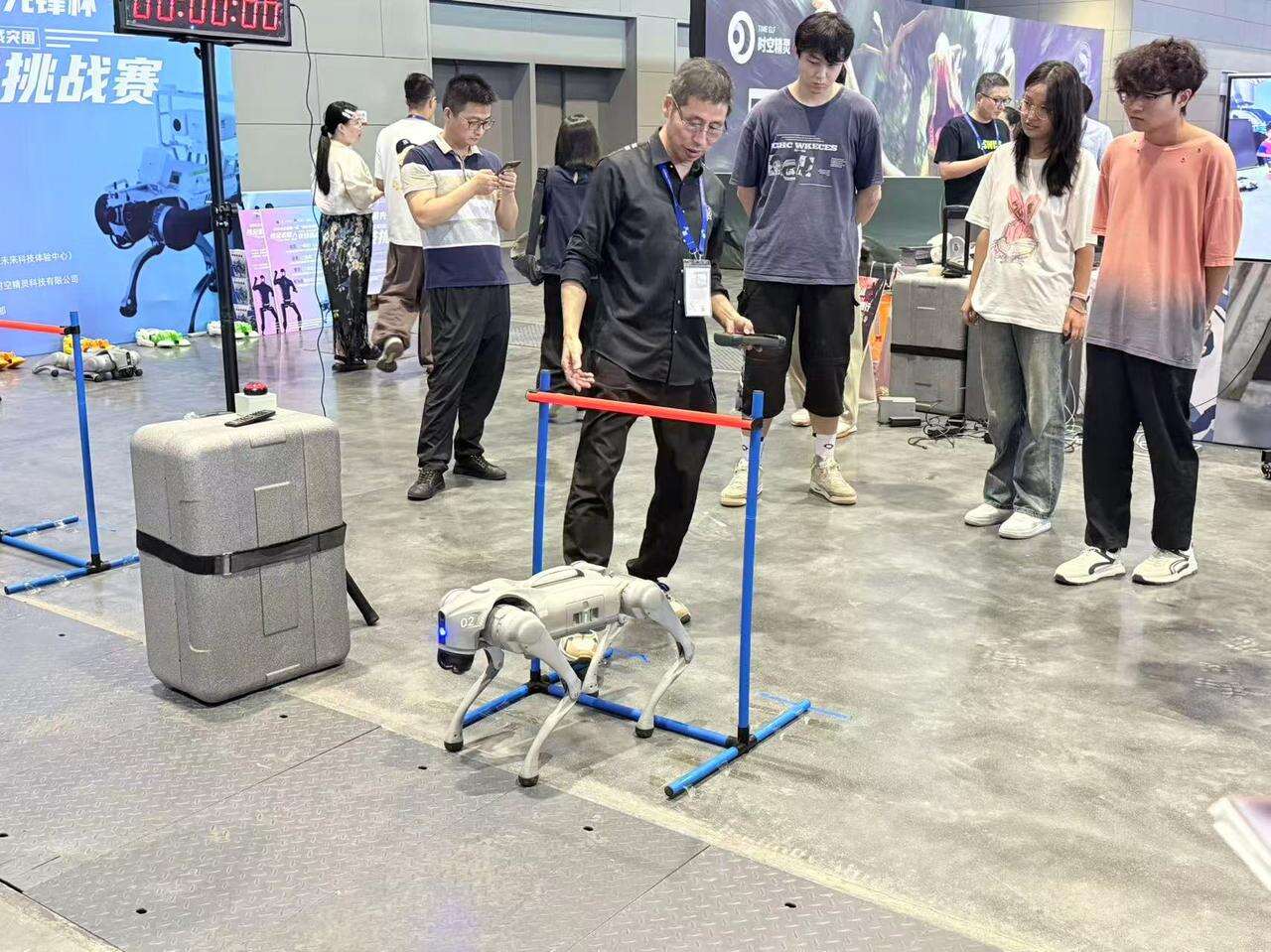 第一次操控四足机器人的李梦兴奋地分享着感受:“特别新奇!上手比想象中快多了,就是转弯时稍微卡了下壳,整体玩得特别尽兴。”正如宋元飞所说,操作远没有想象中复杂,借助操作手柄和现场工作人员的指导,哪怕是零基础的观众,也能快速入门,“障碍赛涉及的动作不复杂,核心就是掌握跳跃时机和方向把控。”