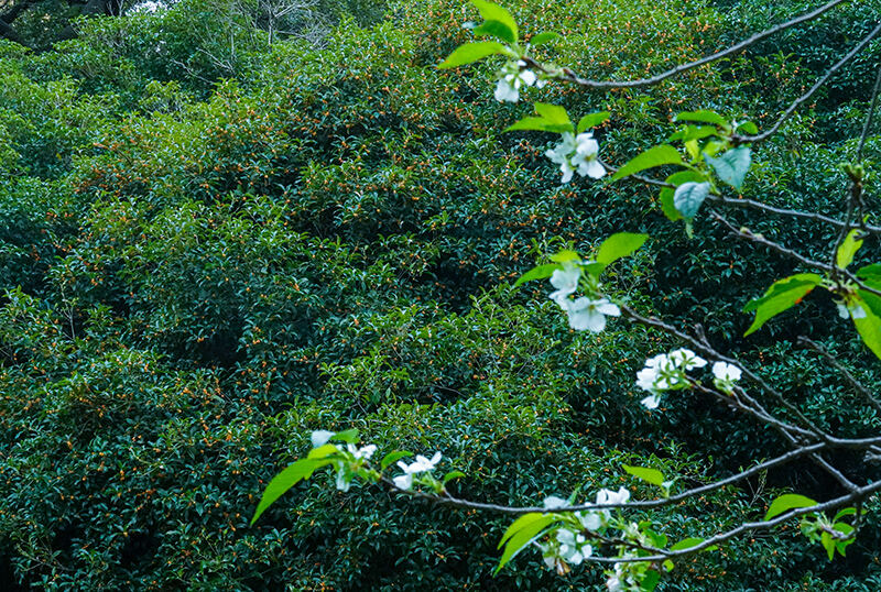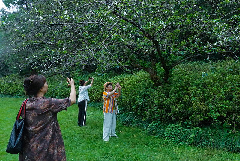 据了解,孤山樱花的常规花期为每年3月中旬至4月上旬,而桂花则多在9月底至10月下旬吐露芬芳,二者正常花期相差近半年,同时绽放的情况极为少见。此次反季开放的樱花,集中在孤山公园入口处,共有3株,枝头缀满白色的花苞与初绽的花朵,微风拂过,尽显柔美;不远处的桂树上,金黄、乳白的桂花成团簇拥,浓郁香气弥漫在空气中,形成“粉白吐艳、金蕊飘香”的奇妙画面。
