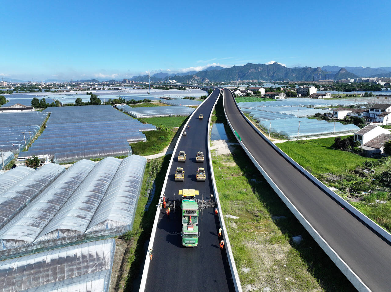 在浙南山区,瑞苍高速建设现场随处可见忙碌身影。括山桥桥面,摊铺机吞吐着滚烫的混合料,压路机“潮汐式”同进同退碾压,摊铺温度、速度及碾压轨迹等关键指标通过均质化管控系统实时采集、智能预警,黑色“缎带”般的路面不断向远方延伸,按照计划,项目路面工程将于10月全部完工。
