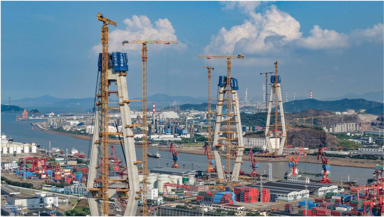 繁忙的甬江入海口,甬江特大桥三座主塔巍然屹立。一大早,40余名作业人员完成安全交底与防护准备后,迅速投入P60主塔的钢筋绑扎、材料转运与模板清理修整等工序。目前,该主塔已完成第36节段施工,累计可视化高度已超200米,相当于一栋70层高的摩天大楼,主塔预计将于10月底实现封顶。