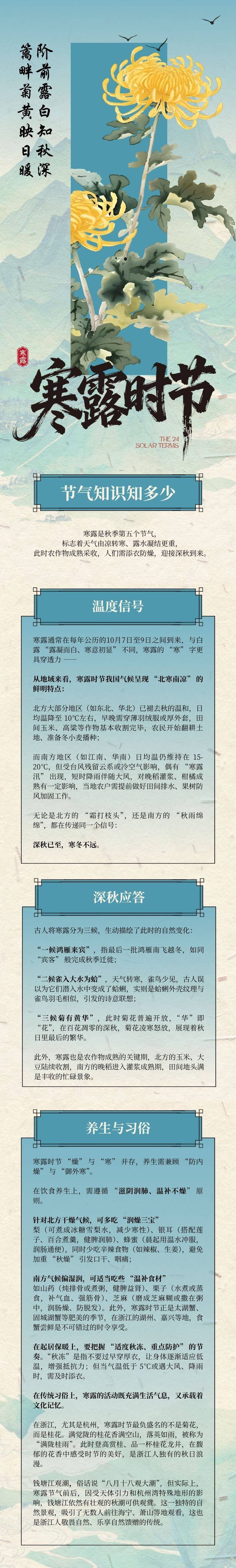 这幅长图将带你感受寒露时节的气候物候、传统习俗与文化内涵,在日渐寒冷的天气里,寻得一份内心的温暖与安宁。