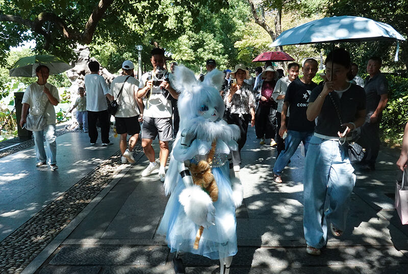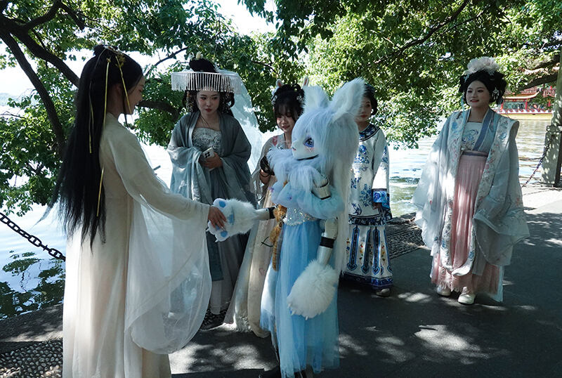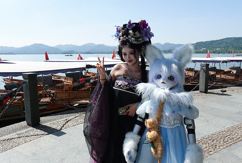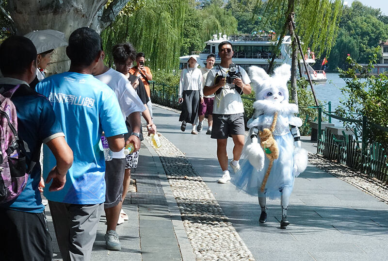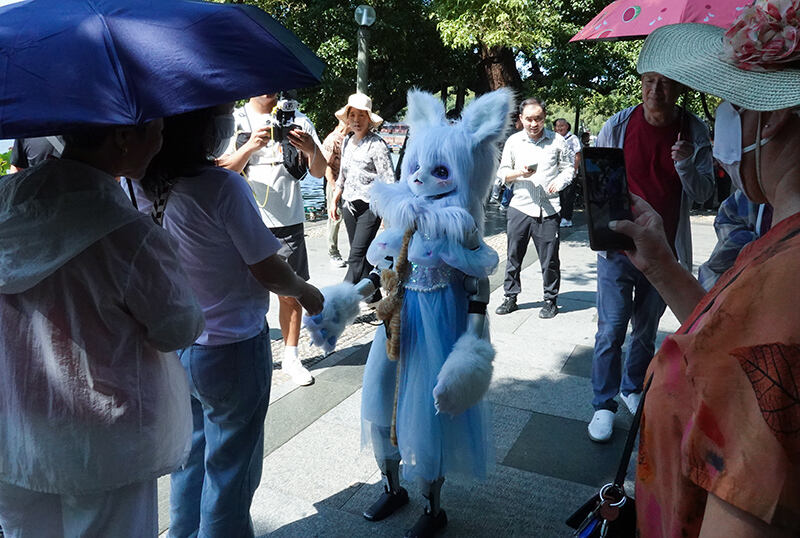 萌态可掬的兔耳、炯炯有神的大眼睛、烂漫可爱的蓝色纱裙……乍眼一看,这个漫步西湖边的人形机器人仿佛一个萌萌的小女孩。和刘女士一样,许多初次邂逅这位“机器人萌妹”的游客都感到十分新奇,纷纷掏出手机拍摄视频,或排队与它合影留念。