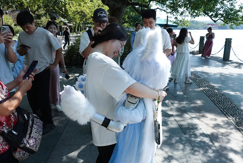 在杭州工作的肖女士,则趁着父母从内蒙古来杭旅游的机会,带他们逛西湖,并幸运地偶遇了机器人。“之前只在手机上见过,现实中看到还是很意外。”肖女士的母亲更是对杭州赞不绝口:“杭州真的很先进,出行方便,路上的凳子能充电,西湖边还能和机器人亲密接触,真的非常好!”