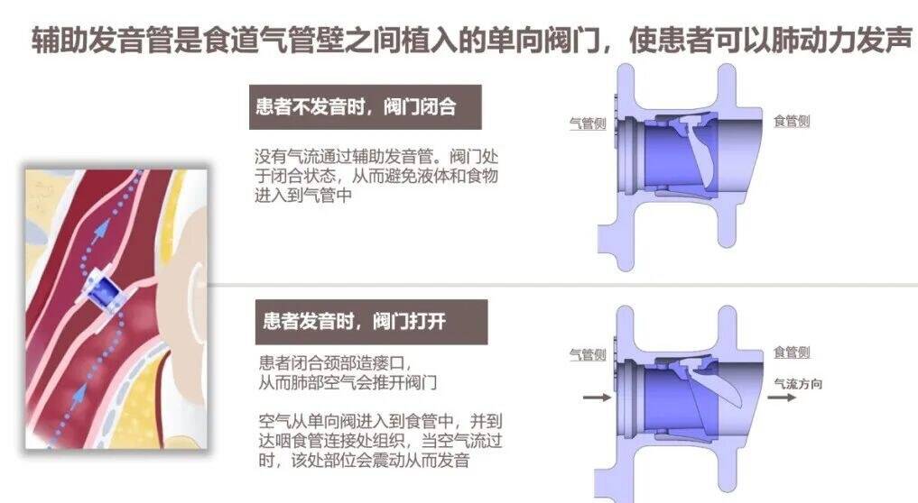 辅助发音管指的是目前临床常用的发声重建装置,它通过手术精准置入气管造瘘口与食管之间的“单向阀门”——既允许肺部气流通过发音管进入食管,振动咽食管段黏膜形成基础音,再经口腔构音形成可辨语言;又能有效阻挡食物、唾液返流至气管,从根源上降低呛咳与呼吸道感染风险。