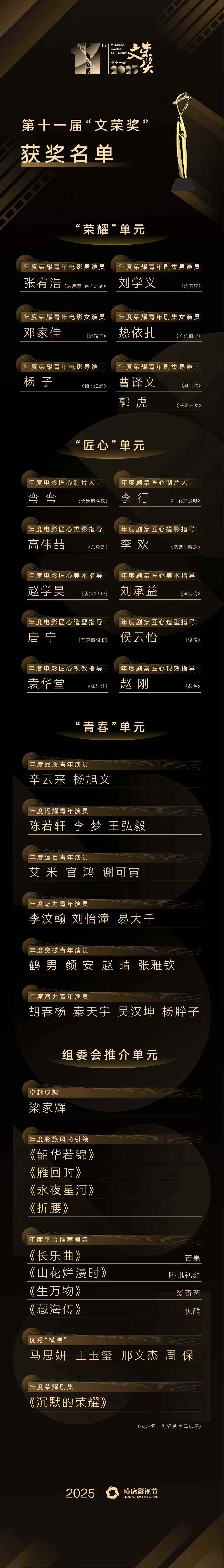 其中,“荣耀单元”聚焦台前创作,设立年度荣耀青年电影导演、青年电影男演员、青年电影女演员,以及年度荣耀青年剧集导演、青年剧集男演员、青年剧集女演员等六大奖项;“匠心单元”致敬幕后英雄,涵盖年度匠心摄影指导、美术指导、造型指导、视效指导、制片人等五大奖项;“青春单元”重在发掘表彰具有突出表现和发展潜力的青年演员,设置了年度青春品质演员、年度青春闪耀演员、年度青春瞩目演员、年度青春魅力演员、年度青春突破演员、年度青春潜力演员等奖项。
