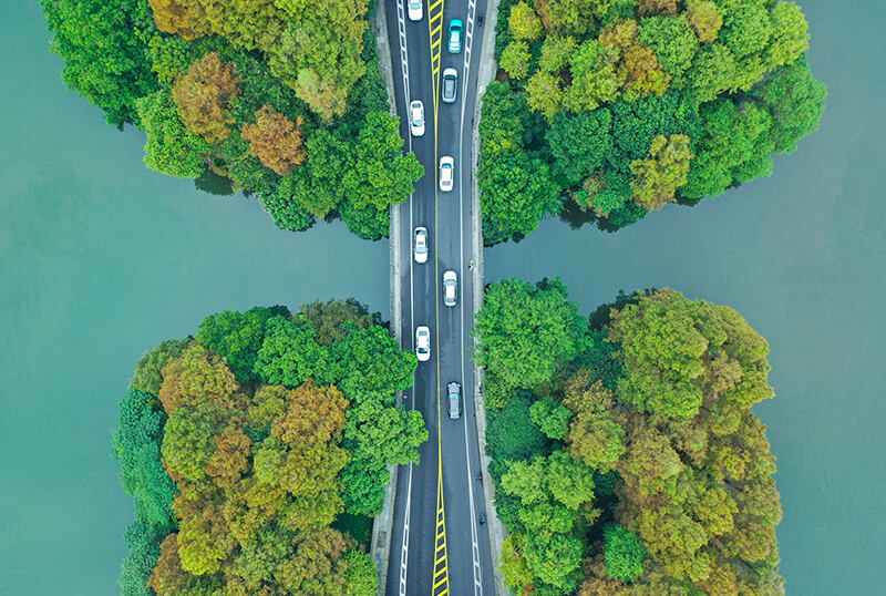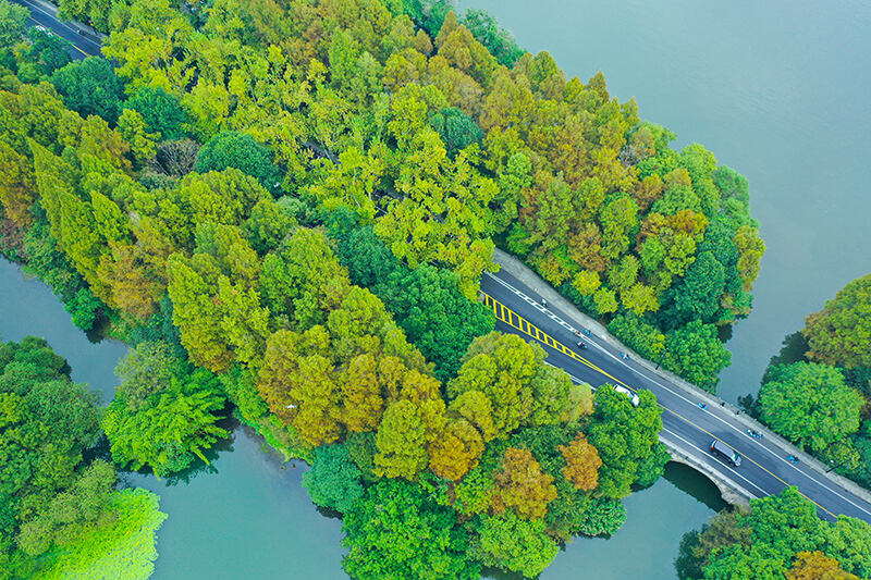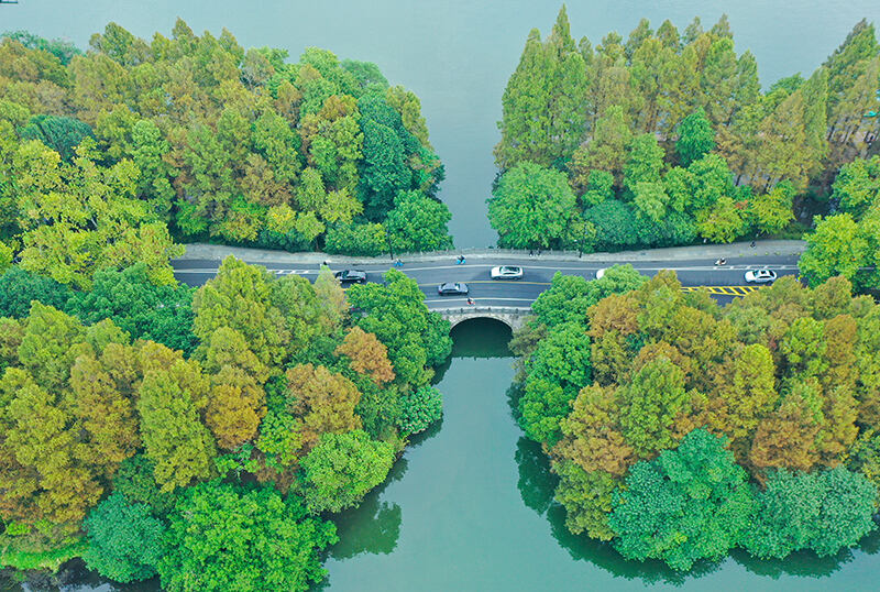 浙江在线11月10日讯(记者 陈天怀)气温持续走低,杭州的秋日氛围感已拉满。杨公堤上,悬铃木、水杉等行道树渐次褪去绿装,逐渐换上“黄金甲”,从空中俯瞰,整条堤道宛如一条黄绿相间的长廊,六桥起伏间,金黄叶片倒映水中,光影迷离,尽显清幽诗意。