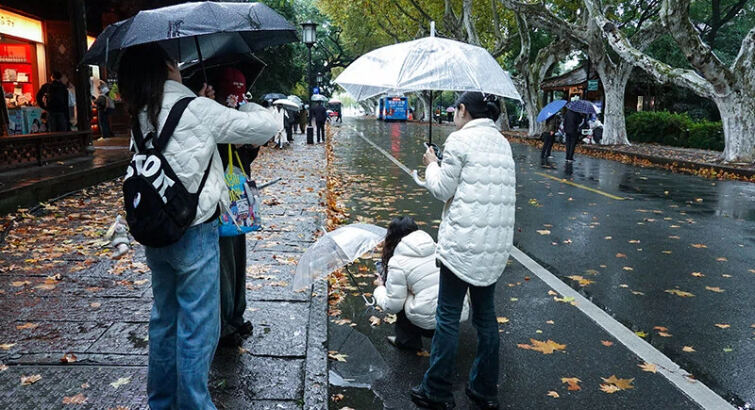 在孤山路,飘落的梧桐叶为道路镶嵌了一条“金边”。来自上海的游客王女士和朋友举着手机拍照,她裹着厚外套,一手撑伞,却难掩兴奋:“来杭州看西湖秋景,没想到遇上寒潮,虽然冷,但落叶满地的样子比想象中更有意境,太值得了。”王女士告诉记者,来之前提前查了天气预报,特意带了羽绒服,“虽然气温低还有雨,但能看到这样的秋日盛景,觉得太值得了。”