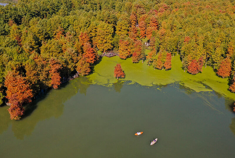 眼下,万余棵水杉已褪去部分绿意,枝叶渐染浓艳橙红,与碧绿湖面相映成趣,色彩碰撞极具视觉冲击力。来自河北邯郸的李先生带着家人开启一周杭州之旅,青山湖是他们的第二站,“昨天逛了苕溪沿岸,芦苇的景色非常美丽,今天的红杉配绿湖更是惊艳,这样的景致在北方少见,看着大家划船嬉闹,氛围太好了。”