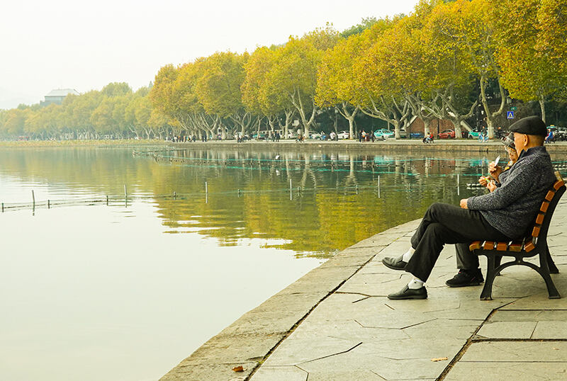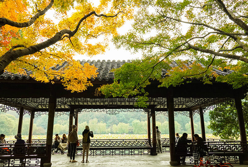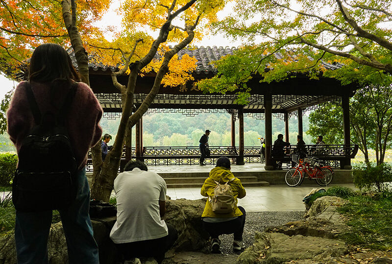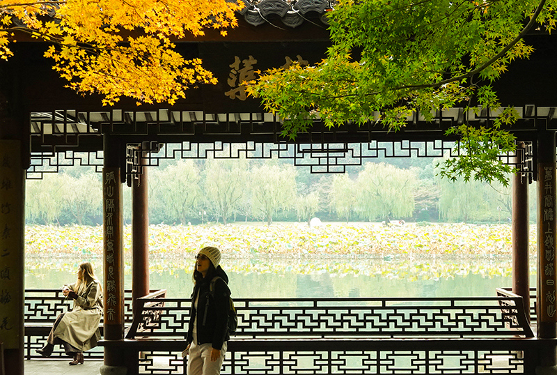 在西泠桥以东、北山路以南的网红亭“绿水芙蕖”处,枫叶正褪去翠绿、染上金黄,深浅不一的色彩与碧水相映,成为新晋拍照热点。来自香港的黄先生一家特意将住处选在湖滨,一早便沿湖而行,打卡北山街的金黄梧桐与西湖残荷,在网红亭“绿水芙蕖”的枫树下反复驻足拍摄。“特意来西湖,这层次感比想象中更惊艳,每一步都是风景。”黄先生笑着说,接下来他们还计划前往孤山楼外楼品尝杭帮菜,再漫步苏堤感受西湖韵味。