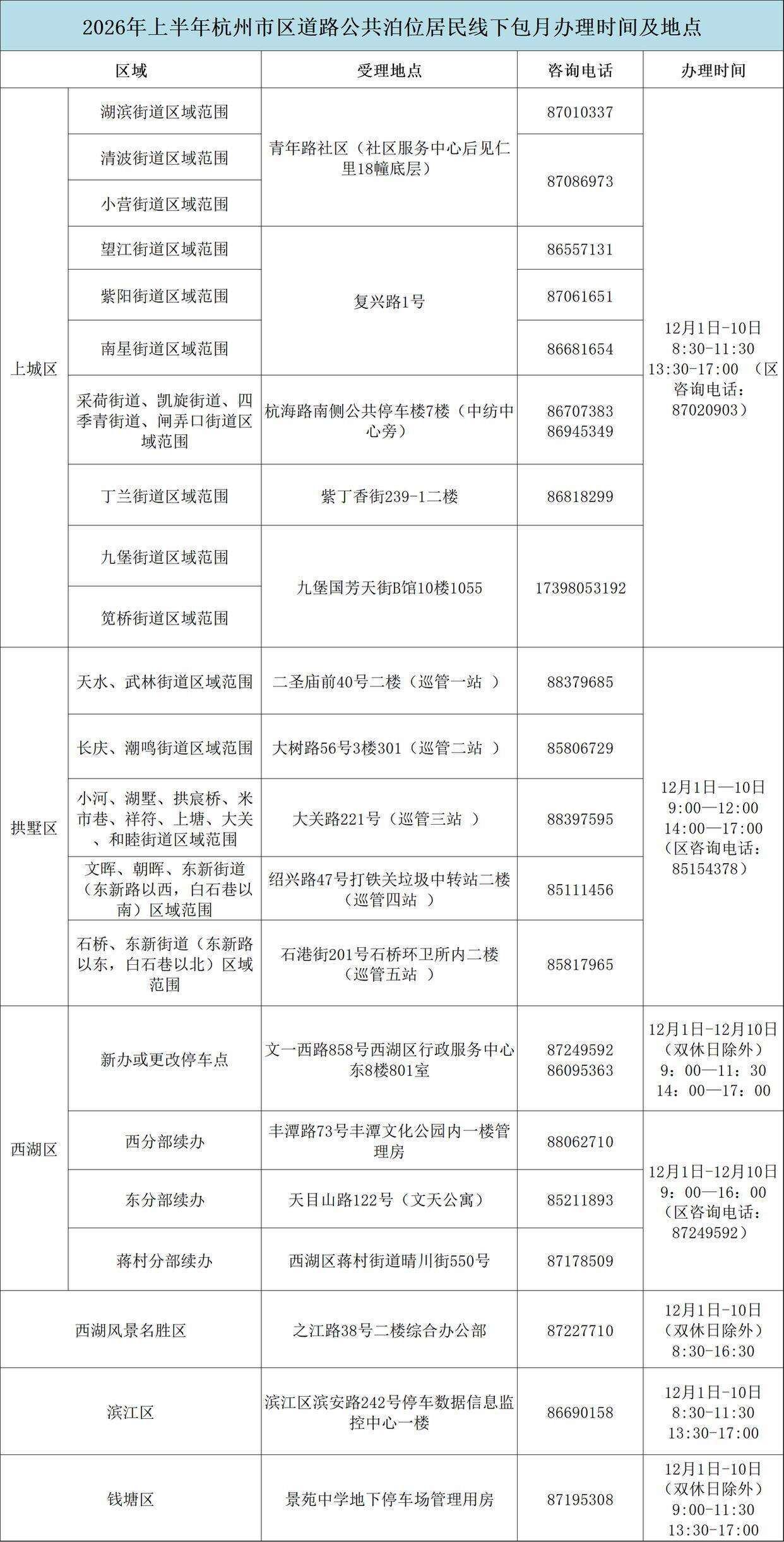 记者从杭州市城市管理局了解到,2026年上半年杭州市区道路泊位居民停车包月将于12月1日至10日集中办理,此次包月业务支持线上、线下同时办理。