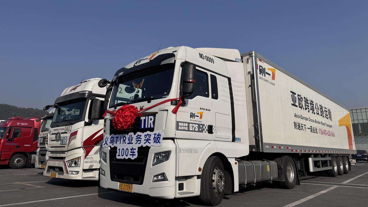 12月1日上午,一辆满载电商货物的国际公路运输(TIR)车辆在办结海关手续后,从义乌快件(跨境)监管中心缓缓驶出,这是从义乌启程的第100辆TIR国际公路运输车辆。