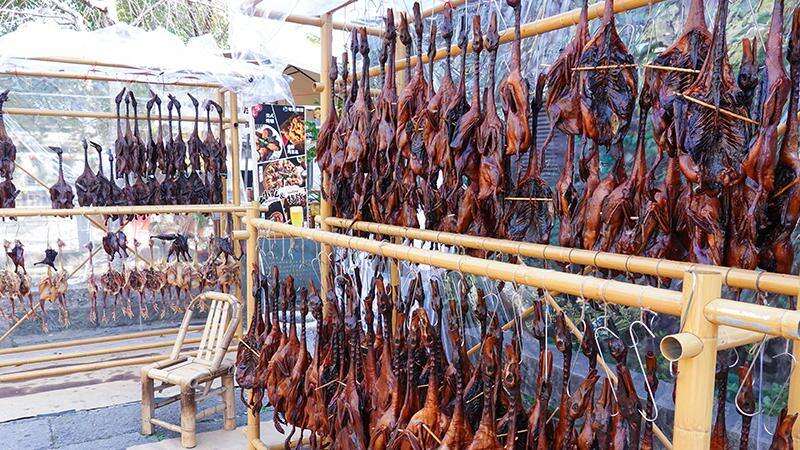 清晨时分,不少市民循着香味赶来选购,还有不少游客拍照打卡。“酱货开始晾晒了,销量最好的是土猪肉酱肉,很多老顾客都是提前预订的。”一家酱货铺的店长周武刚介绍,这款土猪酱肉的猪肉专门从上虞收购,价格保持去年水平,59元一斤;酱鸭则迎来让利,养殖3年的老鸭制作的酱鸭售价168元/只,2年的则从去年的158元/只降至139元/只,较去年略有下调。鸭腿买5送1,酱鹌鹑买10个减20元,每天中午更有免费试吃活动,食客可先尝后买。“现在工作日一天能卖出10几只酱鸭,节假日销量翻倍到30多只。去年广受好评的温州高粱肉虽然还没上架,萧山的老顾客已经在微信上问了很多遍了。”周武刚说。