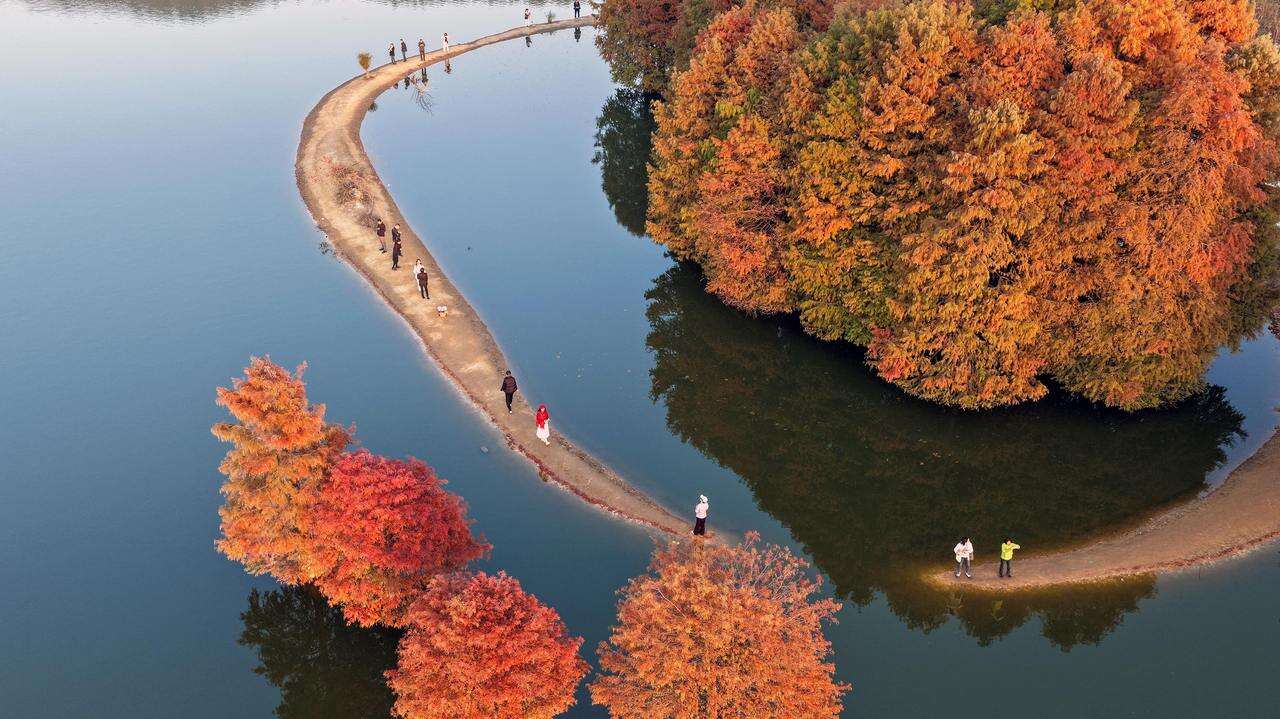 漫步库区,数十株池杉褪去翠绿,换上浅红、金黄、火红的斑斓盛装,与月牙形步道、粼粼波光相映成趣,水下根系若隐若现,与水面倒影构成完美对称的“天空之镜”,让人不由陶醉其中。“月牙弯”堤坝上,10余辆来自河南、杭州、宁波等地的房车一字排开,车载咖啡、茶饮生意火爆,游客们坐在休闲椅上喝茶聊天。沿着堤坝走向水中央,才算真正闯进这幅冬日限定画卷。不少游客和摄影爱好者纷纷驻足于此,近距离亲水赏景、定格美好,享受绝佳景致。