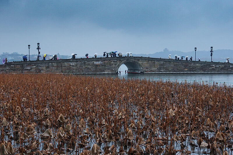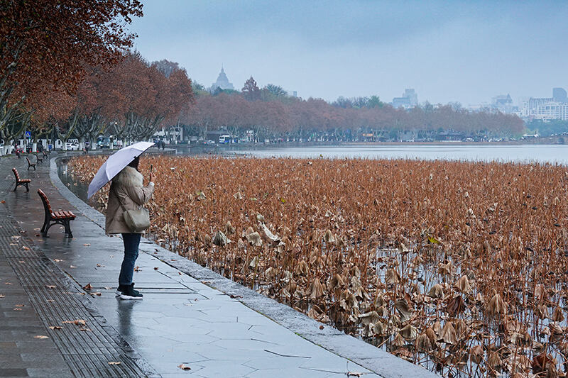 虽然寒意料峭,但仍有不少游客专程前来赏冬,大家裹紧厚羽绒服、配齐围巾帽子,打着雨伞定格西湖的冬雨时节。细雨迷蒙之中,梧桐叶落、残荷“垂头”,伴随着雾气升腾,别有一番风骨和韵味。
