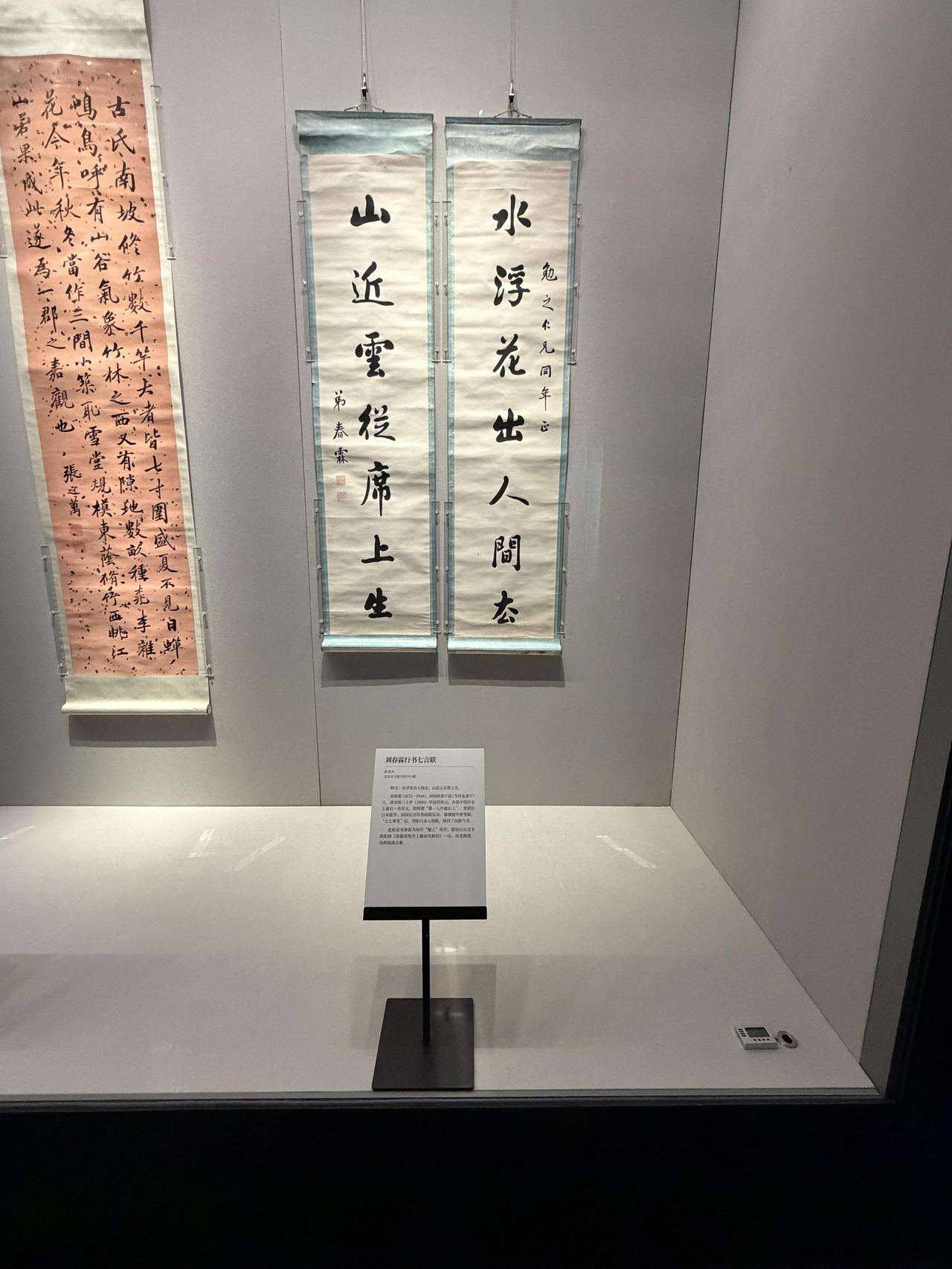 展览最后一幅作品出自清光绪三十年(1904)甲辰科状元刘春霖,他也是中国历史上最后一名状元,曾被派往日本深造,回国后历任咨政院议员、福建提学使等职。“七七事变”后,日伪曾多次以高官厚禄邀刘春霖为日伪政权效力,但都遭到他的严词拒绝。此次展出的“刘春霖行书七言联”是他为同年“勉之”所作。联语出自北宋欧阳修《寄题景纯学士藏春坞新居》一诗,用笔圆厚,结构饱满含蓄。
