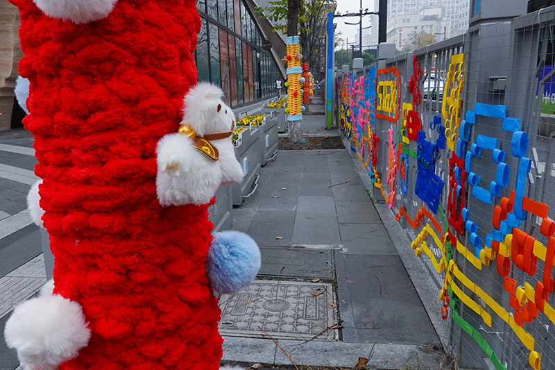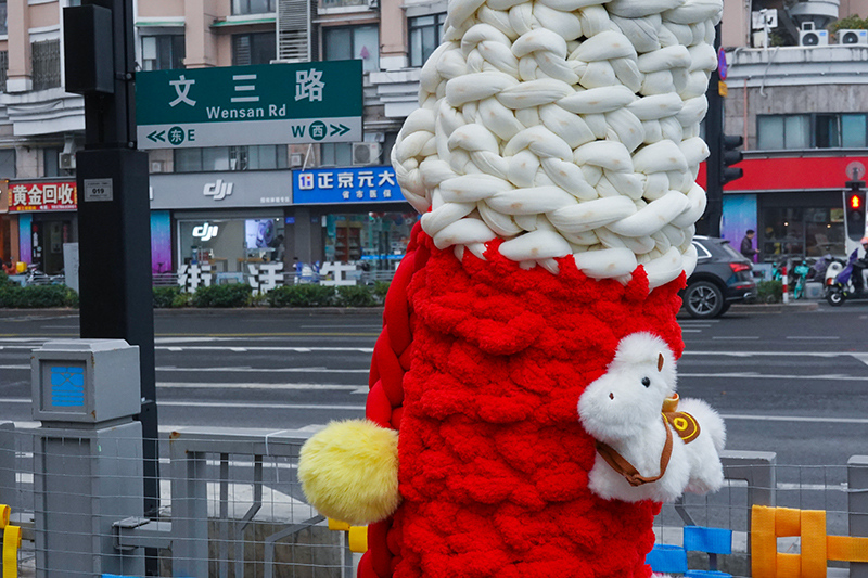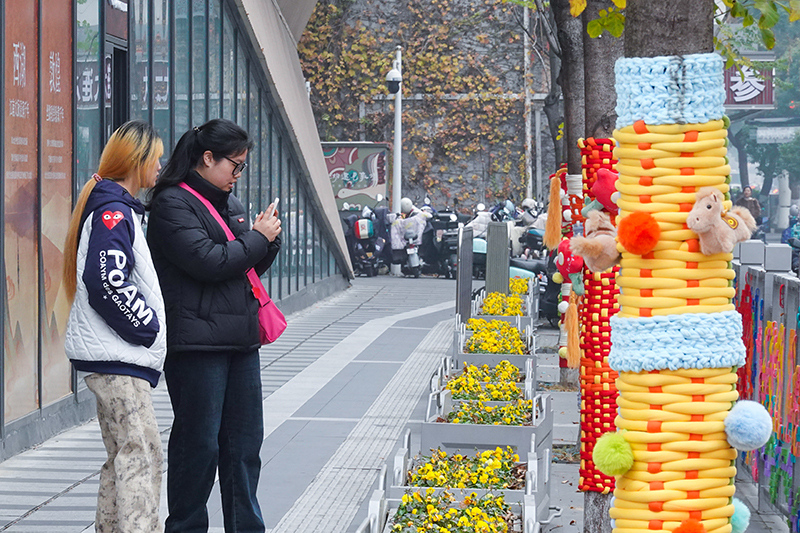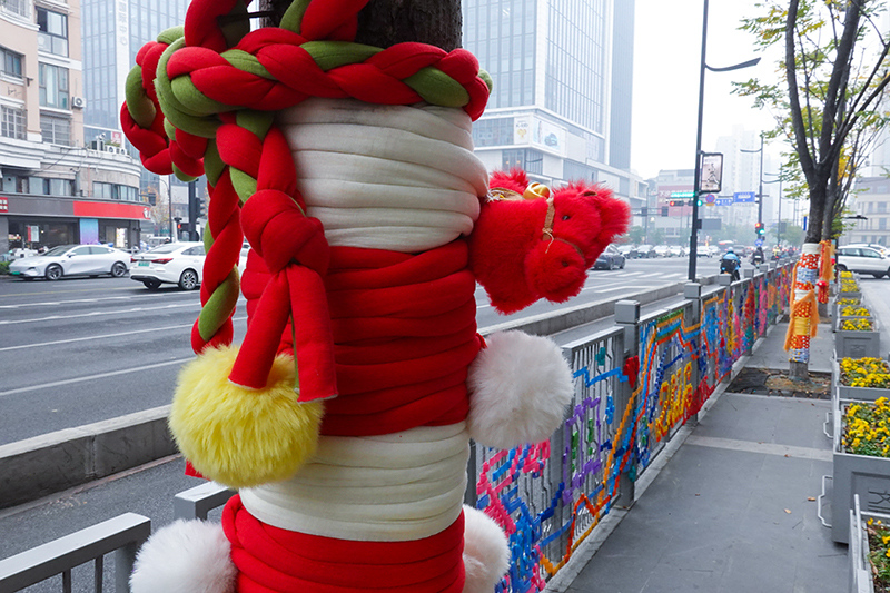 12月30日上午,记者来到文三数字生活街区“西湖遇见敦煌”书香艺术空间至0101PARK路段,只见沿街10棵大树都换上了量身定制的“毛线新衣”。多巴胺配色的针织面料软糯厚实,小马图案、喜庆红花与吉祥表情包错落分布,“马到成功”“马上好运”的美好寓意被一针一线织进衣料。更让人会心一笑的是,“树马一条街”的叫法暗藏巧思,既贴合马年主题,又呼应文三街昔日“数码一条街”的城市记忆,老杭州们都忍不住点赞。