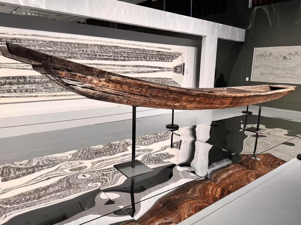 “这艘船是我在运河边上购买的。”张捷说,“过去它是两岸百姓的摆渡船,我把诗文刻在上面,用这种方式唤醒观者对大运河的历史文化记忆。”文字中的橹声、砧声与船本身形成奇妙的呼应,仿佛将运河边的市井生活娓娓道来。