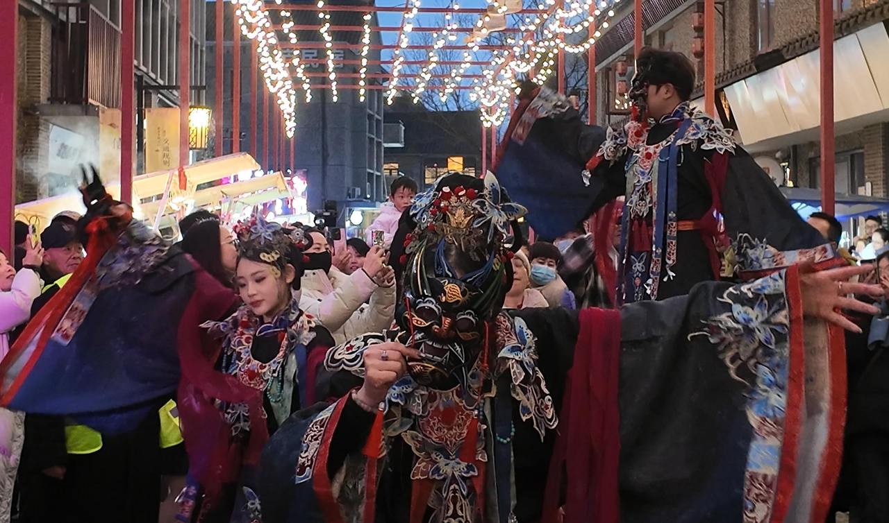 面具翻飞、舞步铿锵,演员们在新年的烟火气中生动演绎着祈愿风调雨顺、五谷丰登的古老传统。