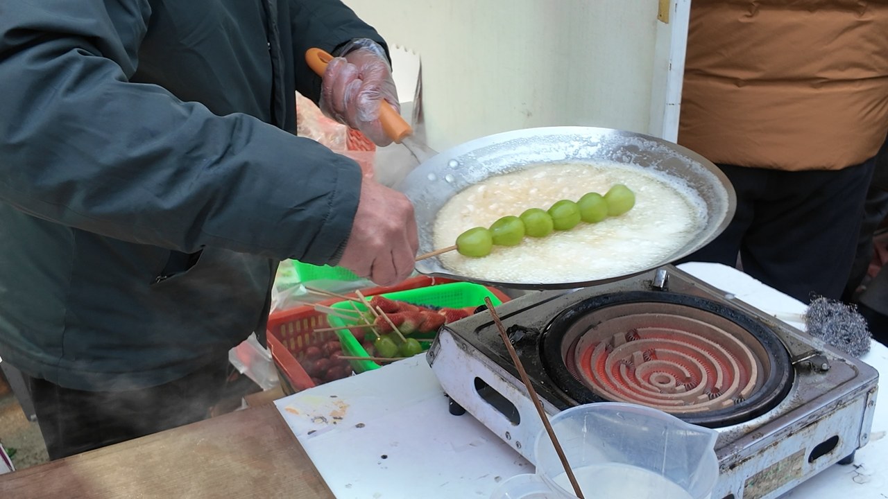 冰糖葫芦的煮糖锅里咕嘟冒着糖泡,孩子们围在一旁,目不转睛地看着贾老板手提串果,轻巧浸入糖浆。“(糖色)变黄就那么一瞬,谈不上技巧,关键还是火候。”他手腕轻转,蘸糖、提拉,一切从容自若。