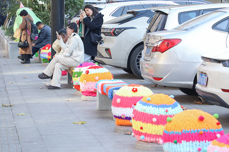 一旁正在拍照的学生小宋和同学们也对石墩赞不绝口,“穿上这样的毛衣让冷冰冰的石墩子变得很有温度,而且冬天走累了或者等公交车坐在上面都不觉得冷。”她们一边变换姿势合影,一边将照片分享到社交平台,记录这份冬日小美好。家住采荷的市民何女士路过时也忍不住驻足拍摄,她本身就会织毛衣,深知这些“冬衣”的用心,“这‘毛衣’一圈圈排列得很整齐,织起来也不简单,从上到下每一圈的尺寸都不同,细节上就体现出温度。”