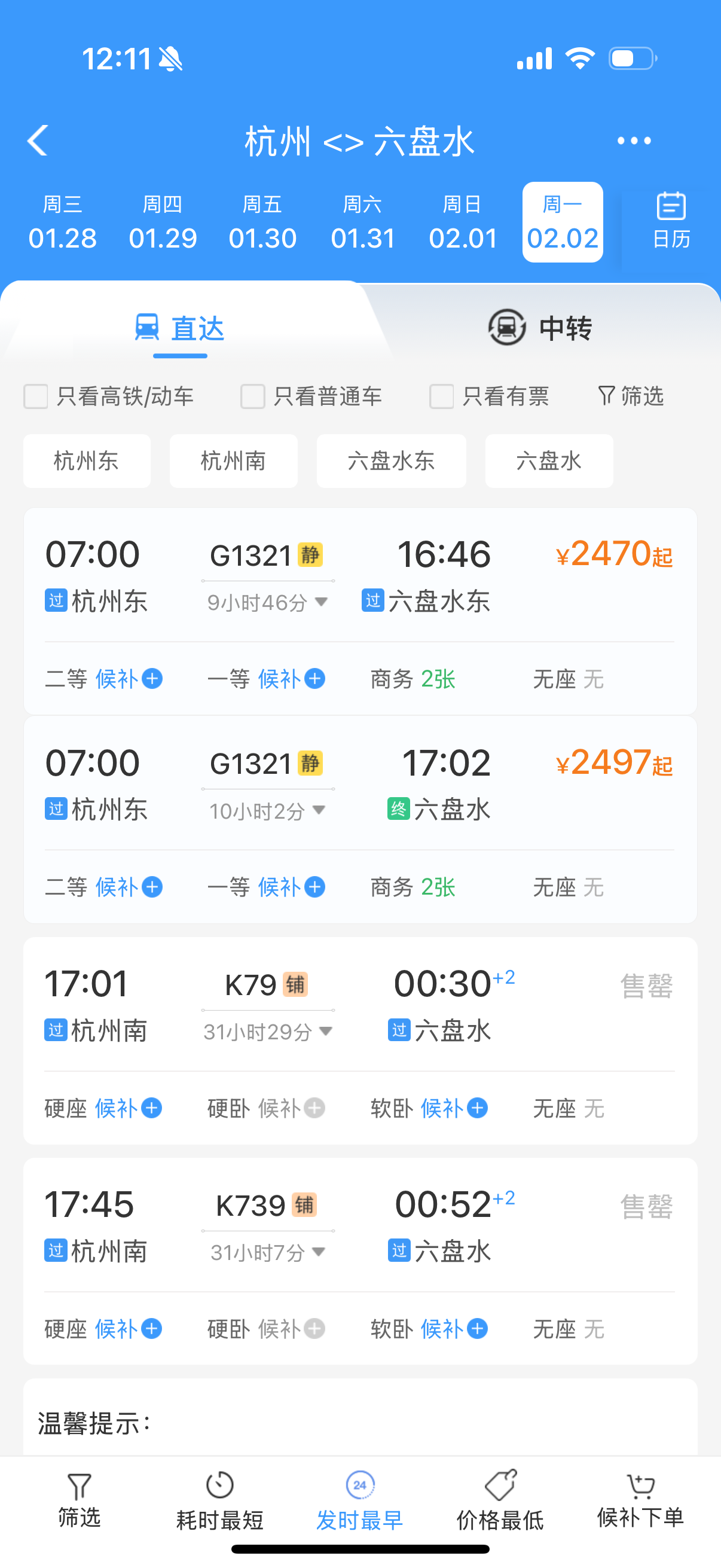 杭州-六盘水车票 12306网站截图