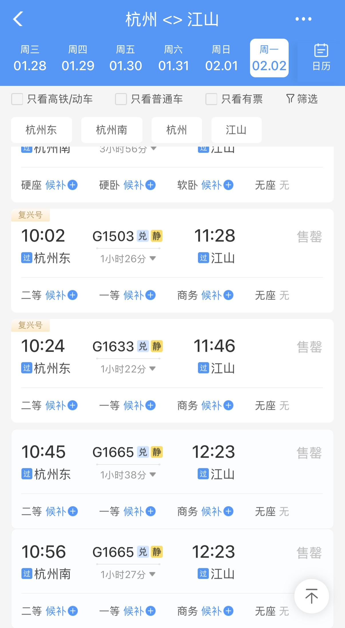 杭州-江山售票页面 12306网站截图
