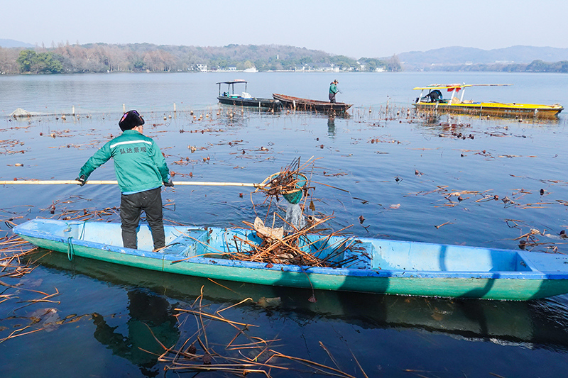 西湖残荷收割现场 记者 陈天怀 摄