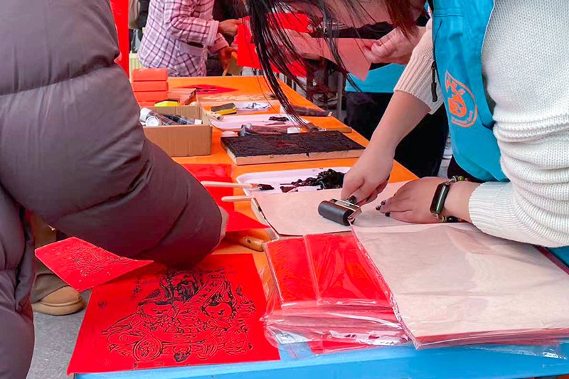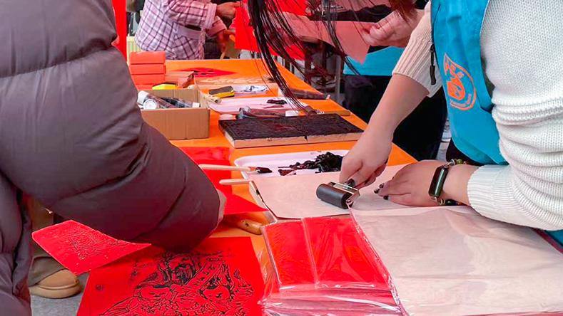 民俗体验区更是人气爆棚。新年拓印台前,小马、福字、貔貅等吉祥纹样的模板整齐排列,志愿者按压拓印,一张张带着墨香的拓印作品新鲜出炉,成为独特的新春纪念。隔壁的书法区,书法爱好者们挥毫泼墨,“福满家门”“龙马精神”等寓意美好的福字、春联跃然红纸之上,市民们按需点题,将满满的新春期许收入囊中。从东站特意赶来的马女士也难掩喜悦:“我今天一早就来了,领了‘马到成功’‘马上有福’的福字,希望新年大家都有福!”