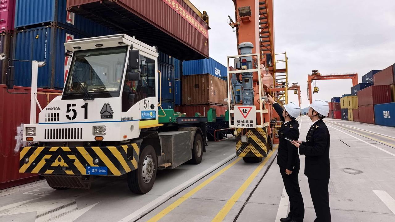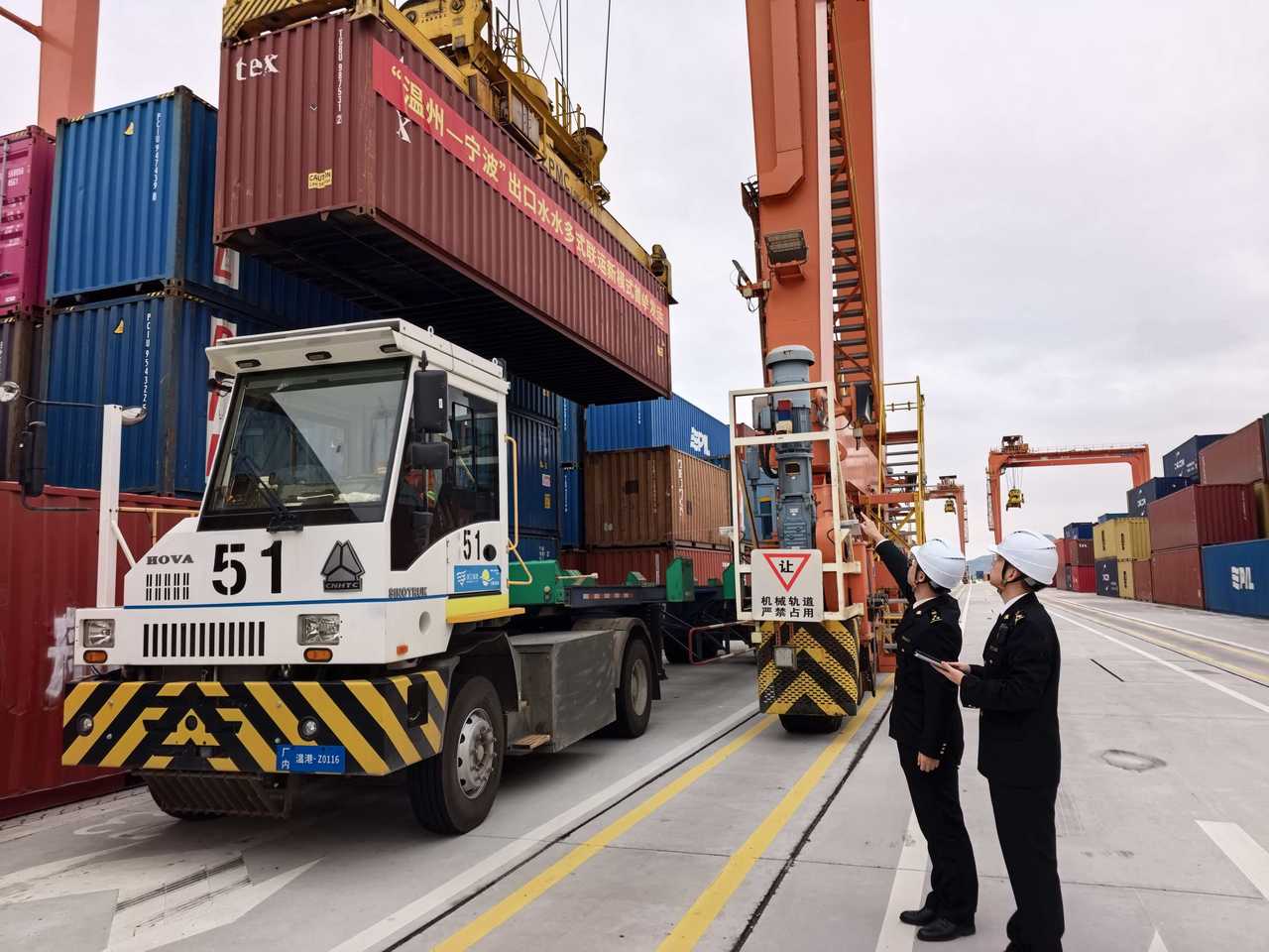 1月27日上午,温州海关关员对浙江首票水水多式联运监管模式出口集装箱开展现场监管 图源杭州海关