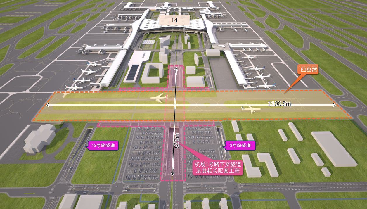 机场1号路隧道上方正在建设的西垂滑工程也将在2026年底建成。西垂直滑是连接机场南北跑道的主干道,核心功能是提升航空器在地面的滑行效率,有效缩短滑行时间,实现“少绕行”。