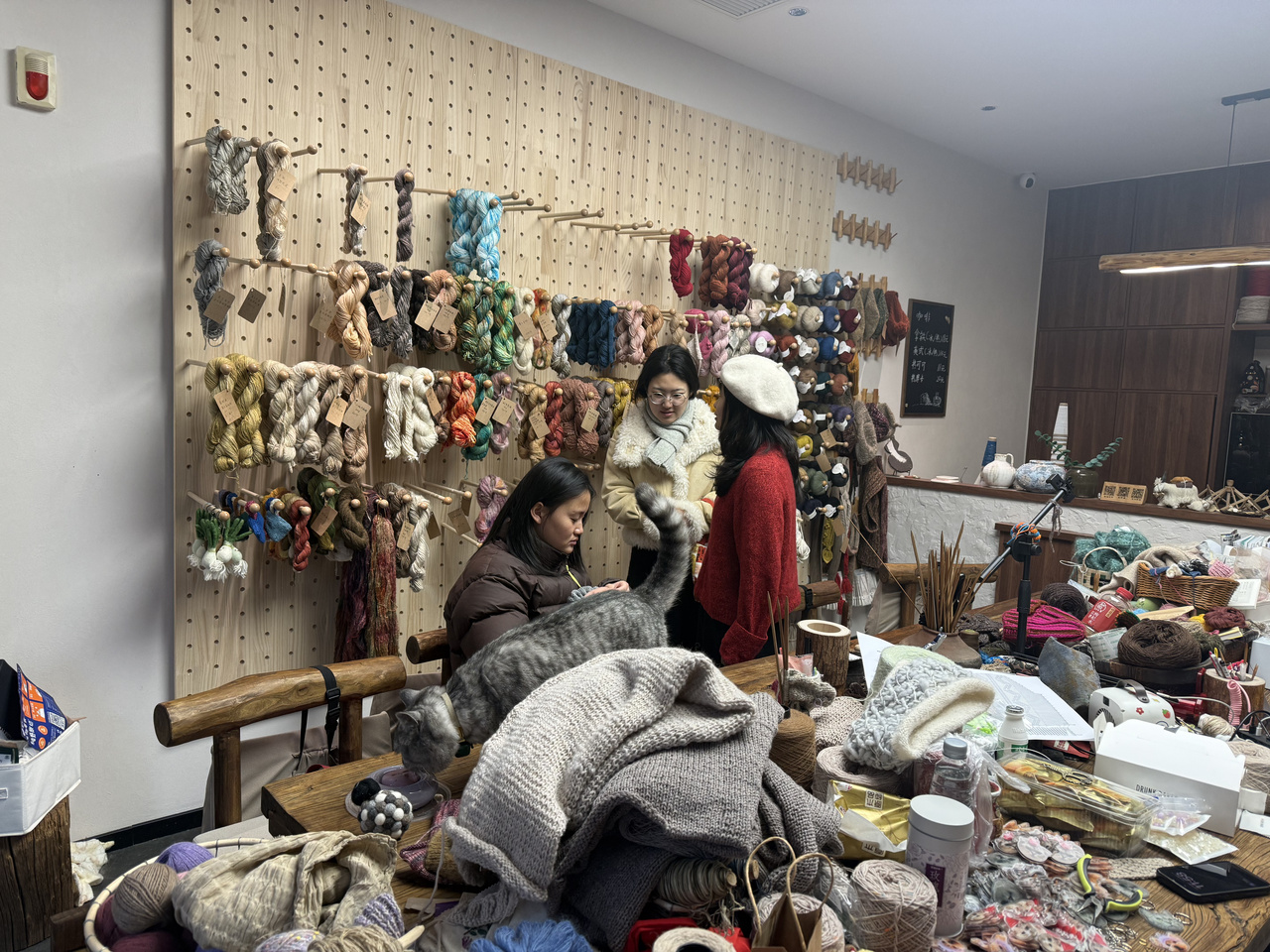 其中最特别的是一位73岁的阿姨。她因照顾孙子来到杭州生活,爱好织毛线的她此前在西湖边的公园寻觅良久,只为找一个能安心坐着织毛衣的地方。这家店开业不久她便来了,不仅成了常客,更主动问:“有没有什么我能帮忙做的?”如今,她甚至成了店里专门负责打样的“专家”。