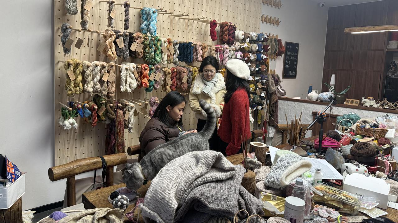 于是,一家“反商业”的店铺诞生了:没有最低消费,也可以自带线材。织女们在此相遇,从“一起织”到“互相教”,再到自发维护这个空间。“现在这样是自然发展的结果,”郭女士说,“我一开始就没有明确规划,是和小姐姐们一起经营,才有了现在这样的生态。”