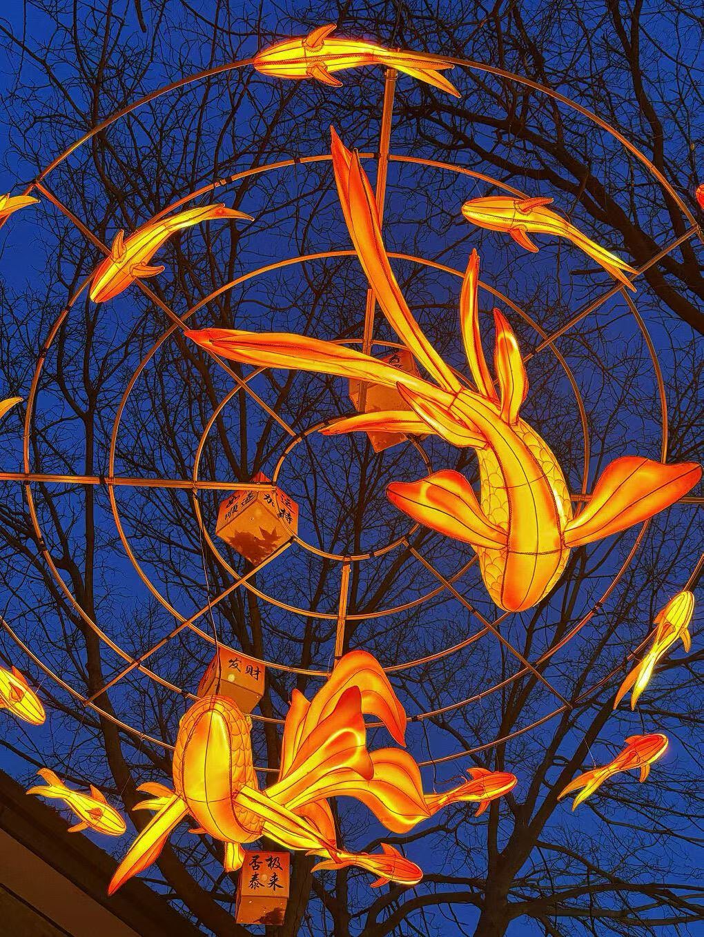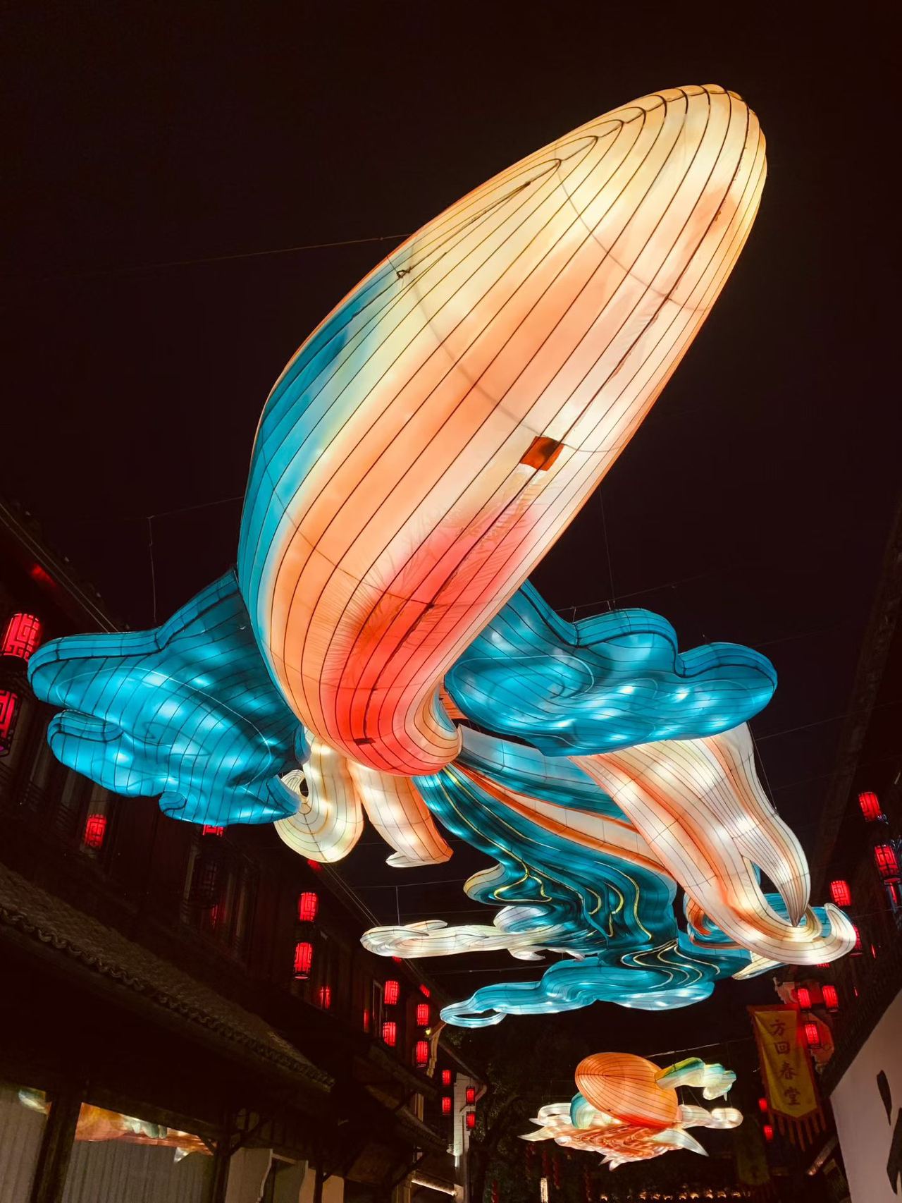桥西历史街区内处处张灯结彩,数百盏传统灯笼沿街高挂,暖黄色的光芒与“大鱼海棠”主题灯组交相辉映。巨型“大鱼”灯组悬浮于半空,鳞片在光影中泛着粼粼波光,仿佛在由灯光模拟的波浪中自在游动。这一设计不仅取材于国漫经典《大鱼海棠》,更融入了“鱼跃龙门、年年有余”的新春祝福,吸引不少市民驻足观赏。“太震撼了!鱼灯像活过来一样,这才是中国年的味道!”带着孩子前来观灯的市民王女士感叹道。