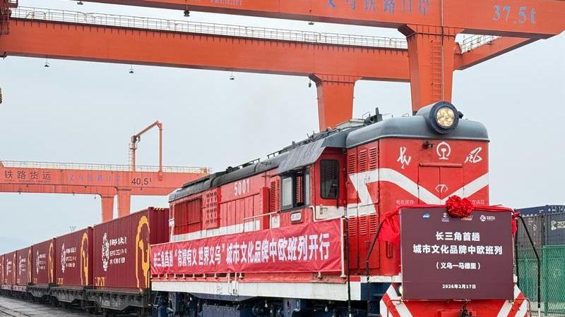 2月17日,随着一声悠长汽笛鸣响,一列满载110个标箱、统一喷涂有“有情有义 世界义乌”城市文化品牌标识的中欧班列,从铁路义乌西站启程,满载着义乌市场畅销的中国风女包、小福马、哭哭马、熊猫颈枕等马年文创产品、日用百货、电子电器和医疗体育器械等商品,经新疆阿拉山口口岸出境,驶往西班牙首都马德里。